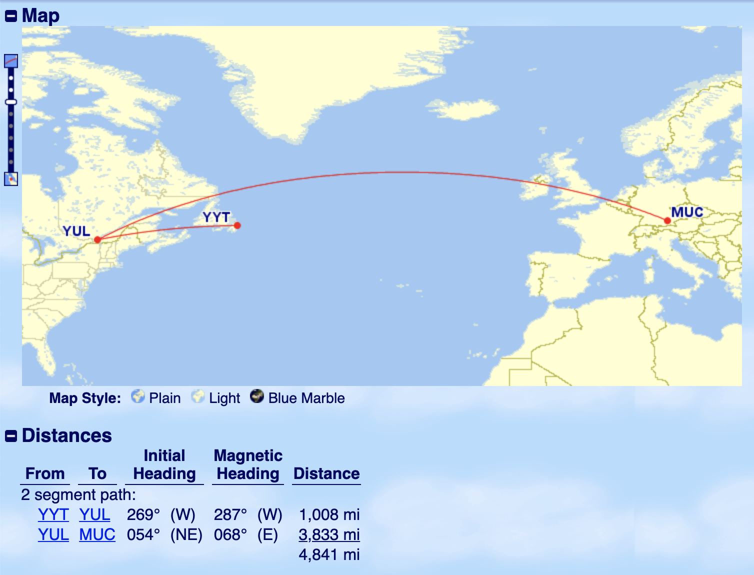 However, in practice, booking St. John's–Munich generally requires backtracking to a hub airport, such as Montreal, in order to catch the transatlantic flight.