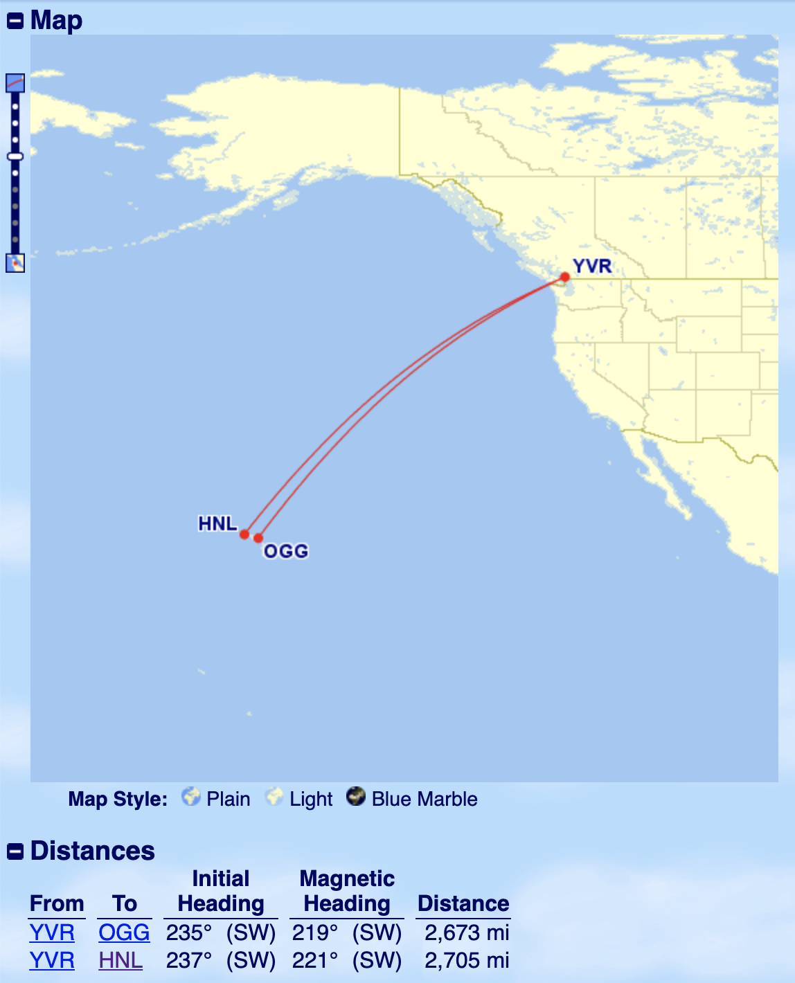 Another very satisfying sweet spot is Hawaii being barely within 2,750 miles of Vancouver, falling just within the third distance band of the "Within North America" chart and flights costing as few as 12,500 Aeroplan points one-way in economy class at the "Starting at" prices listed on the Flight Reward Chart.