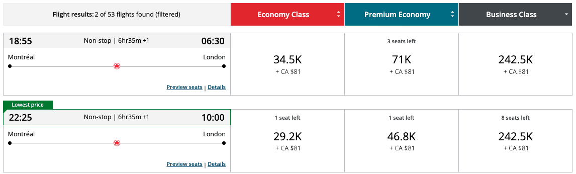 Add 10,000 Aeroplan points for the two stopovers, and we arrive at a total price of 185,000 Aeroplan points for the journey in total.